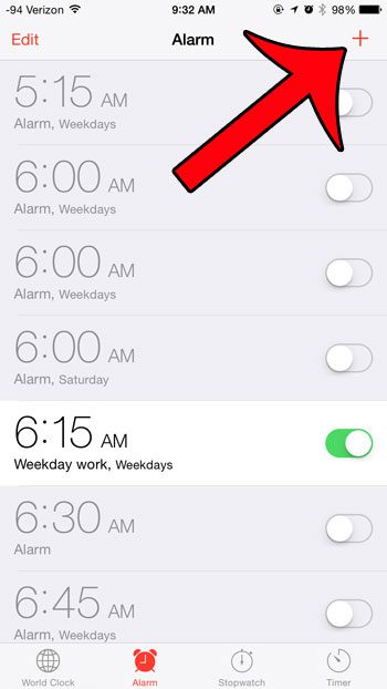 これで、既存のアラームを作成および編集できる画面が表示されます。タップするだけです+画面の右上隅にあるアイコンは、iPhoneでアラームの作成を開始します。