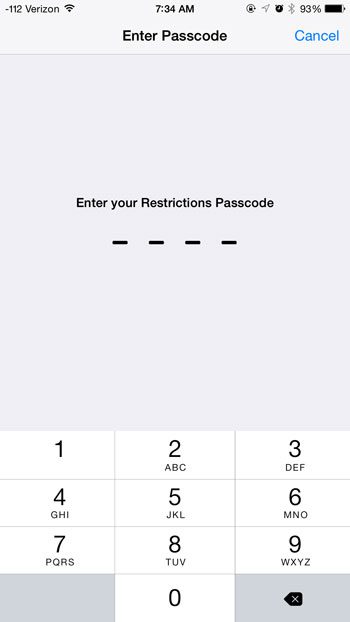 - ステップ4:制限パスコードを入力します。このパスワードは、デバイスのロックを解除するために使用するパスコードとは異なる場合があることに注意してください。