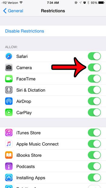 制限メニューを介してカメラアプリの存在を調整する方法がわかったので、必要に応じてそのアクセスをオンまたはオフにすることができます。