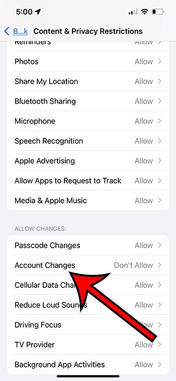 ステップ5:下にスクロールして選択しますアカウント下のオプション変更を許可しますセクション。