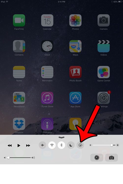 コントロールセンターのボタンとiPadの側面のスイッチは、以下の手順で選択したオプションに基づいて、その機能に関して交互になることに注意してください。たとえば、コントロールセンターから画面の回転をロックできない場合、iPadコントロールセンターはおそらく下の画像のように見えます。
