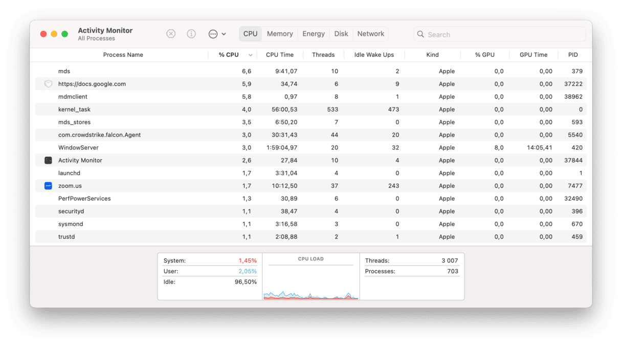 CPU使用は、集中的なアプリの主な指標です。それらをやめると、熱を減らすのに役立ちます。アクティビティモニターを使用して、何が実行されているのか、何をシャットダウンする必要があるかを確認します。