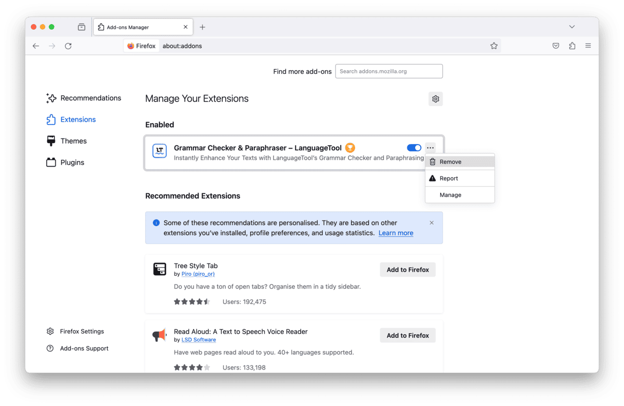 - Firefox:オープンメニュー(3つの水平線アイコン)>アドオンとテーマ>拡張機能。必要のないものを無効にするか、ellipsisをクリックして削除して削除します。