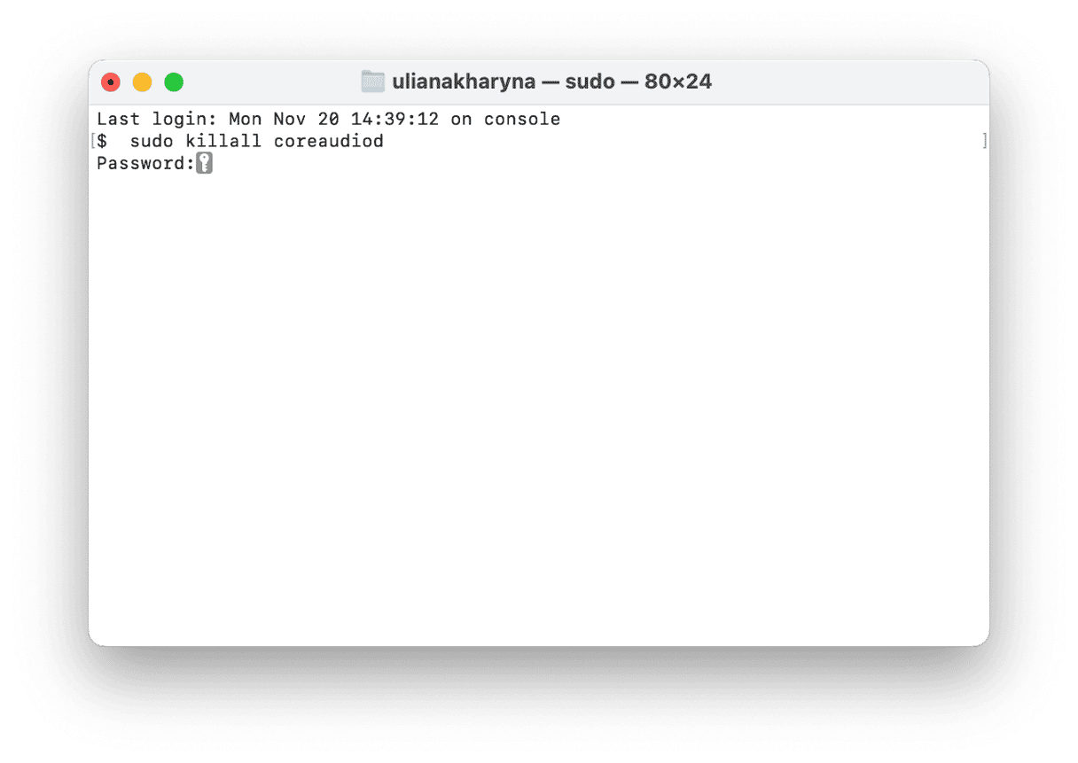 sudo killall coreaudiod - リクエストされている場合は、返されて、管理者パスワードを入力します。