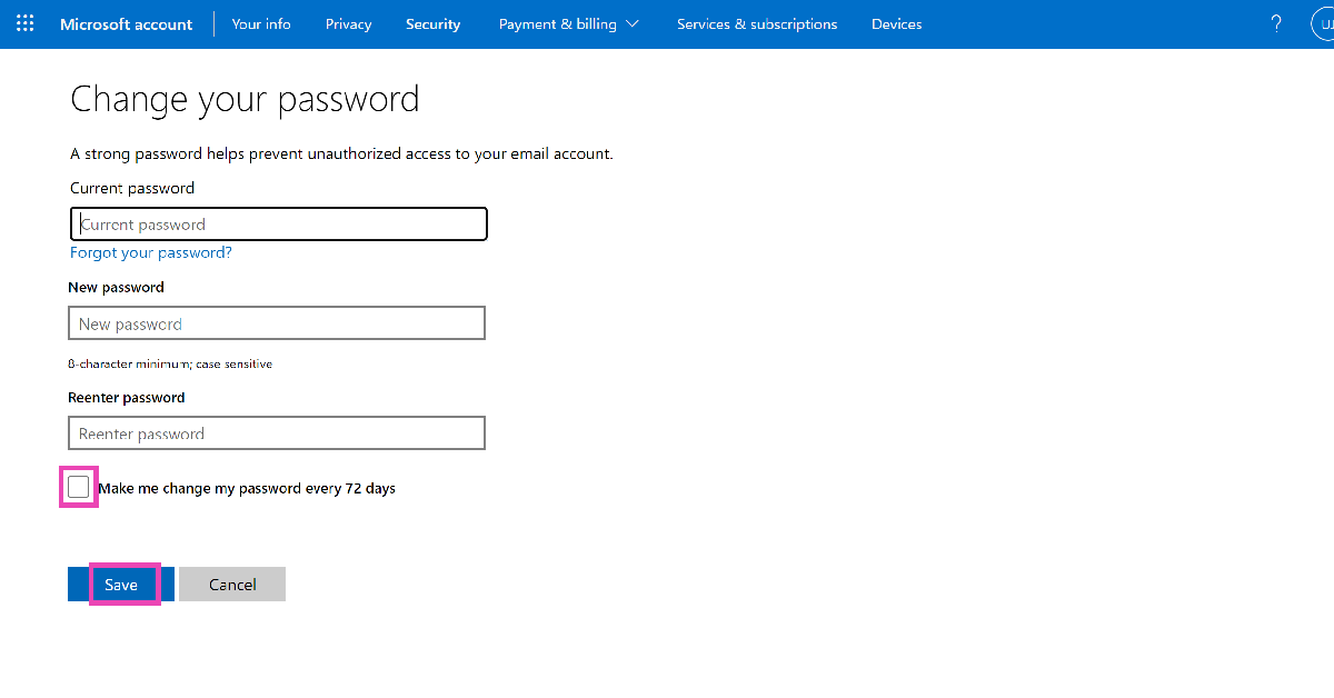 ステップ4:ボックスのチェックを外します72日ごとにパスワードを変更させてください。打つ保存。
