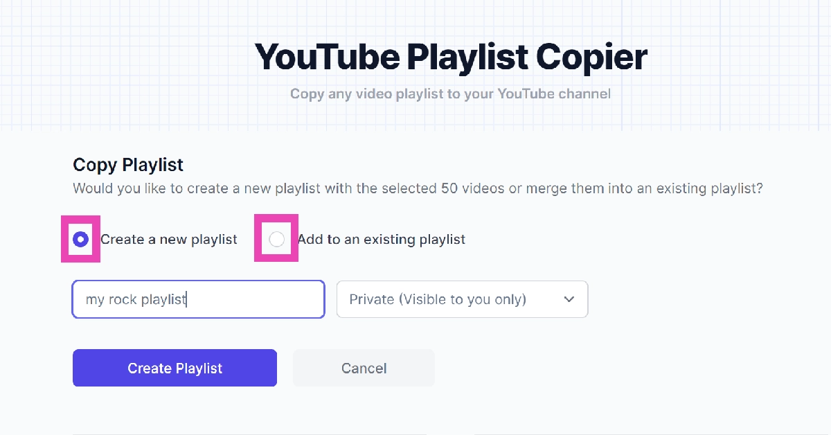 ステップ5:選択します新しいプレイリストを作成します選択したプレイリストの内容をコピーするには。クリックしてください既存のプレイリストに追加しますそれをマージします。