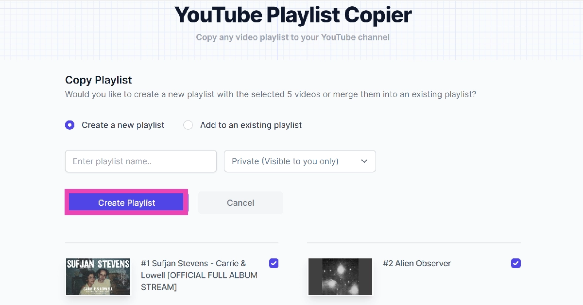 このタスクにも使用できるオンラインツールもいくつかあります。ただし、Googleアカウントへのサードパーティツールアクセスを提供することが含まれます。それでクールでない場合は、最初の方法に固執してください。ただし、サードパーティのツールを使用すると、プレイリストをマージして必要なコンテンツを簡単に選択できます。以下の両方の方法をチェックして、どちらがもっと好きかを確認してください!
