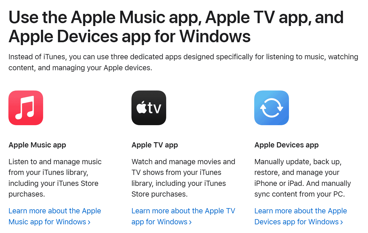 はい、iTunesはWindows 10と11の両方で利用できます。しかし、Microsoftは今提供されていますApple Music、Apple TV、およびデバイス管理のための個別のアプリ新しいWindowsバージョンで。これらのアプリは、特定の機能に対してより合理化されたエクスペリエンスを提供します。